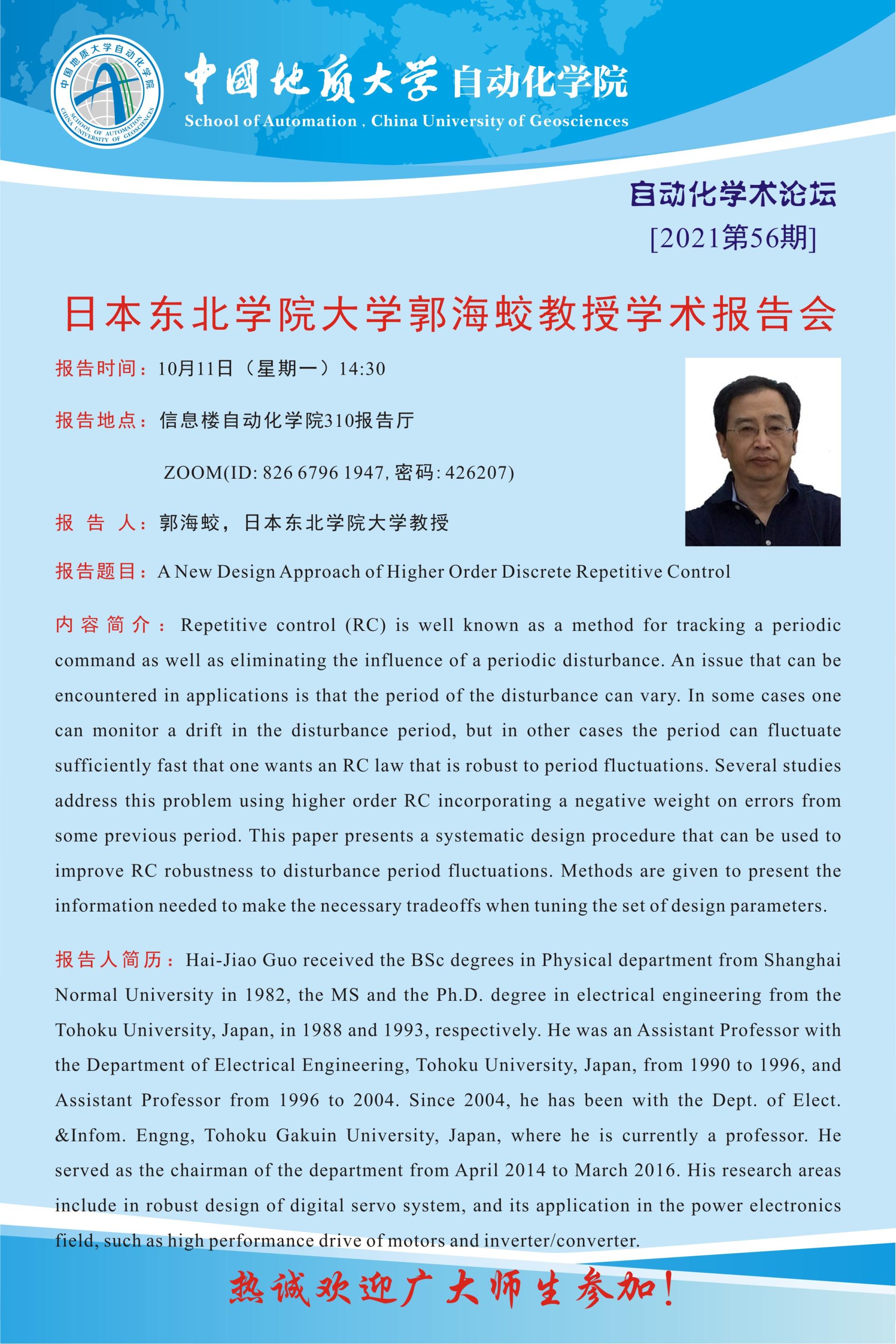 【10月11日】自动化学术论坛:日本东北学院大学郭海蛟教授学术报告