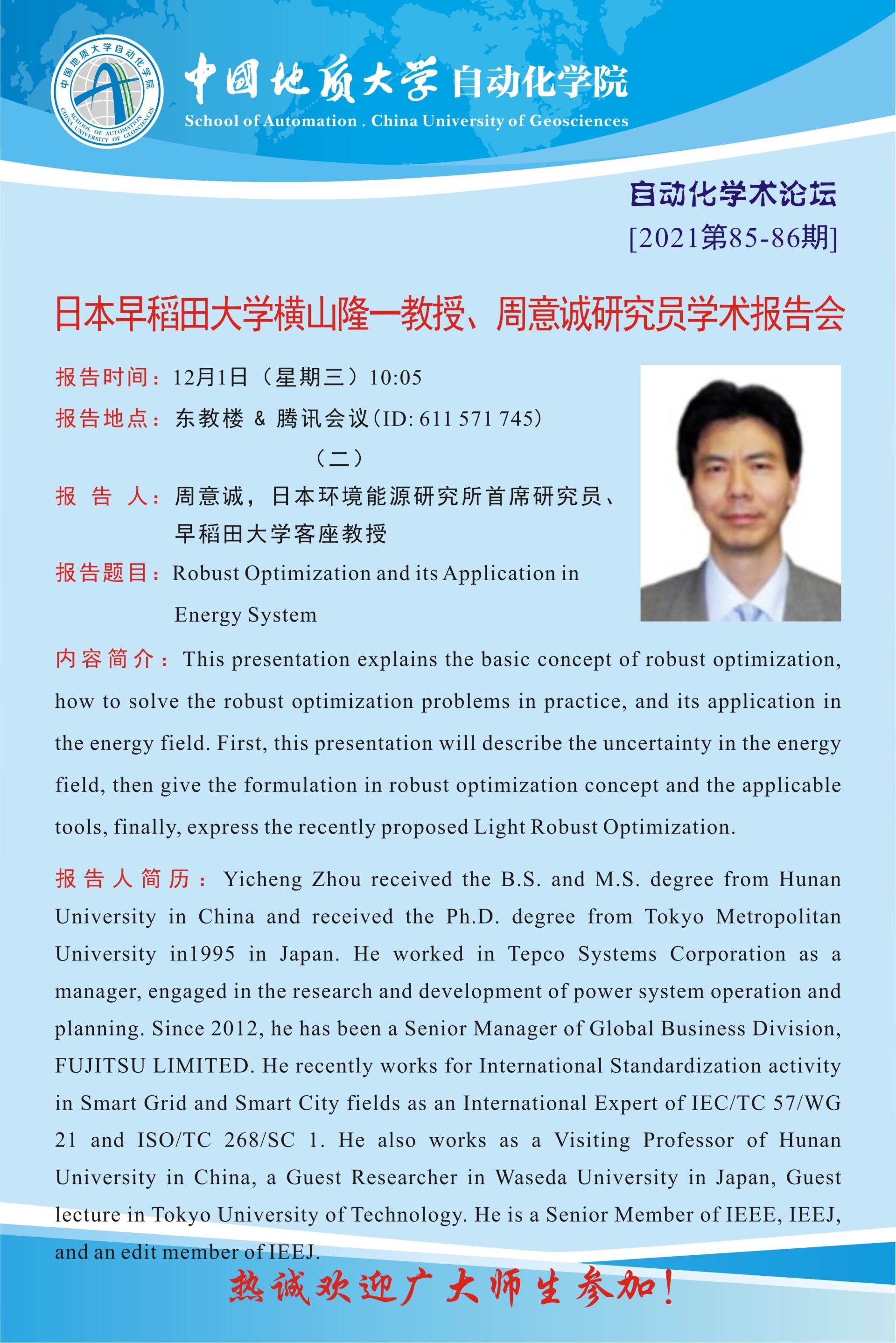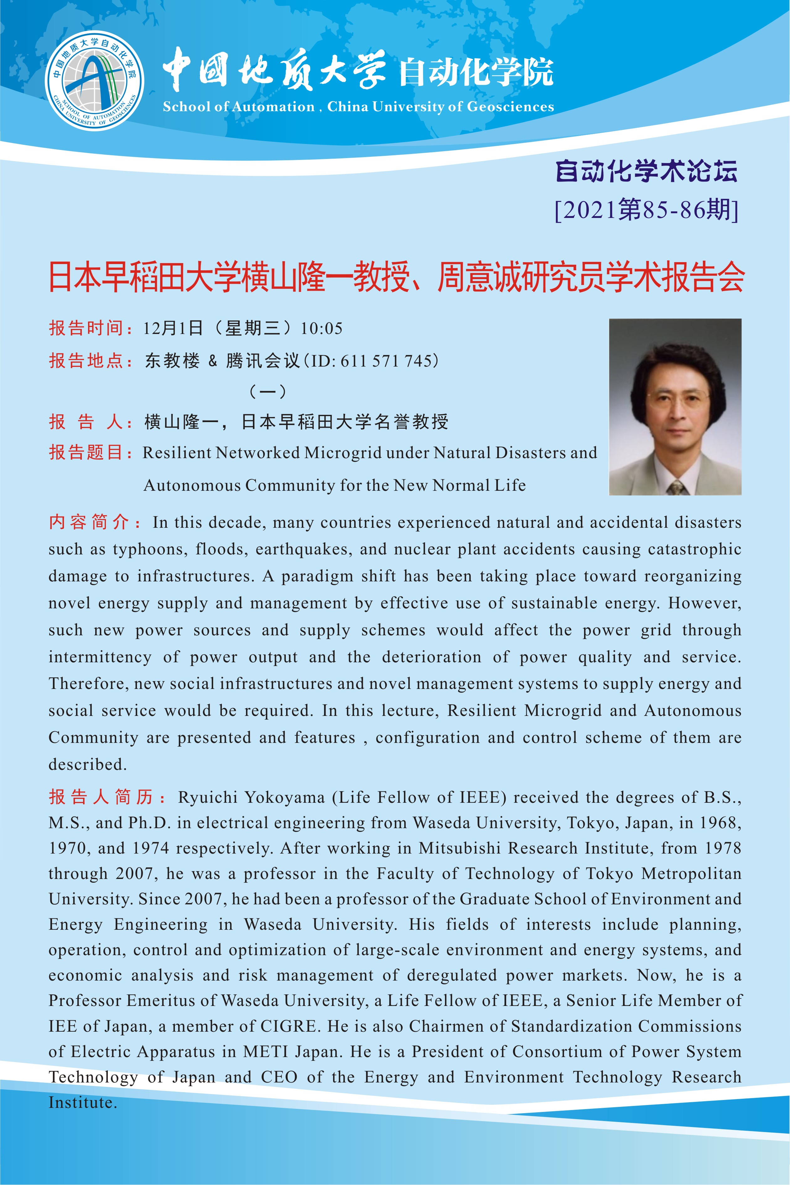 【12月1日】自动化学术论坛:日本早稻田大学横山隆一教授、周意诚研究员学术报告