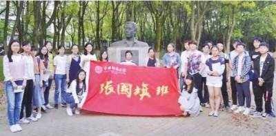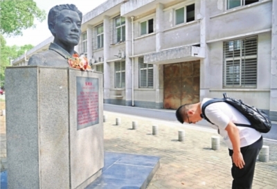 9月2日上午,张云飞到未来城校区报到,中午匆匆吃了几口盒饭,12时30分坐上到南望山校区的校车。下午1时30分,他手捧花束,来到父亲的雕像前,深深地鞠躬。