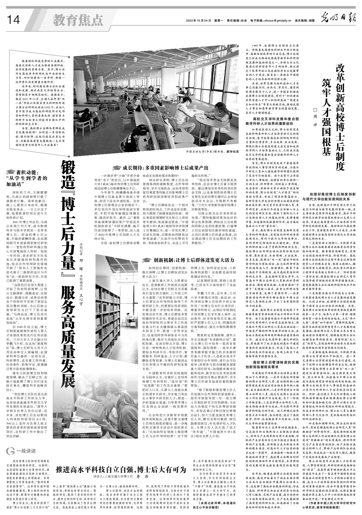 近年来,针对高校博士后队伍建设和发展,相关政策文件陆续出台,管理制度日渐规范细化。数据显示,截至2021年10月,全国已在所有“双一流”学校以及国家重点科研院所设立博士后科研流动站3352个,出站人员中很多成为高校科研院所补充师资和科研人员的重要来源、国家重点科研平台和重大科技项目团队中科研创新的主力军。