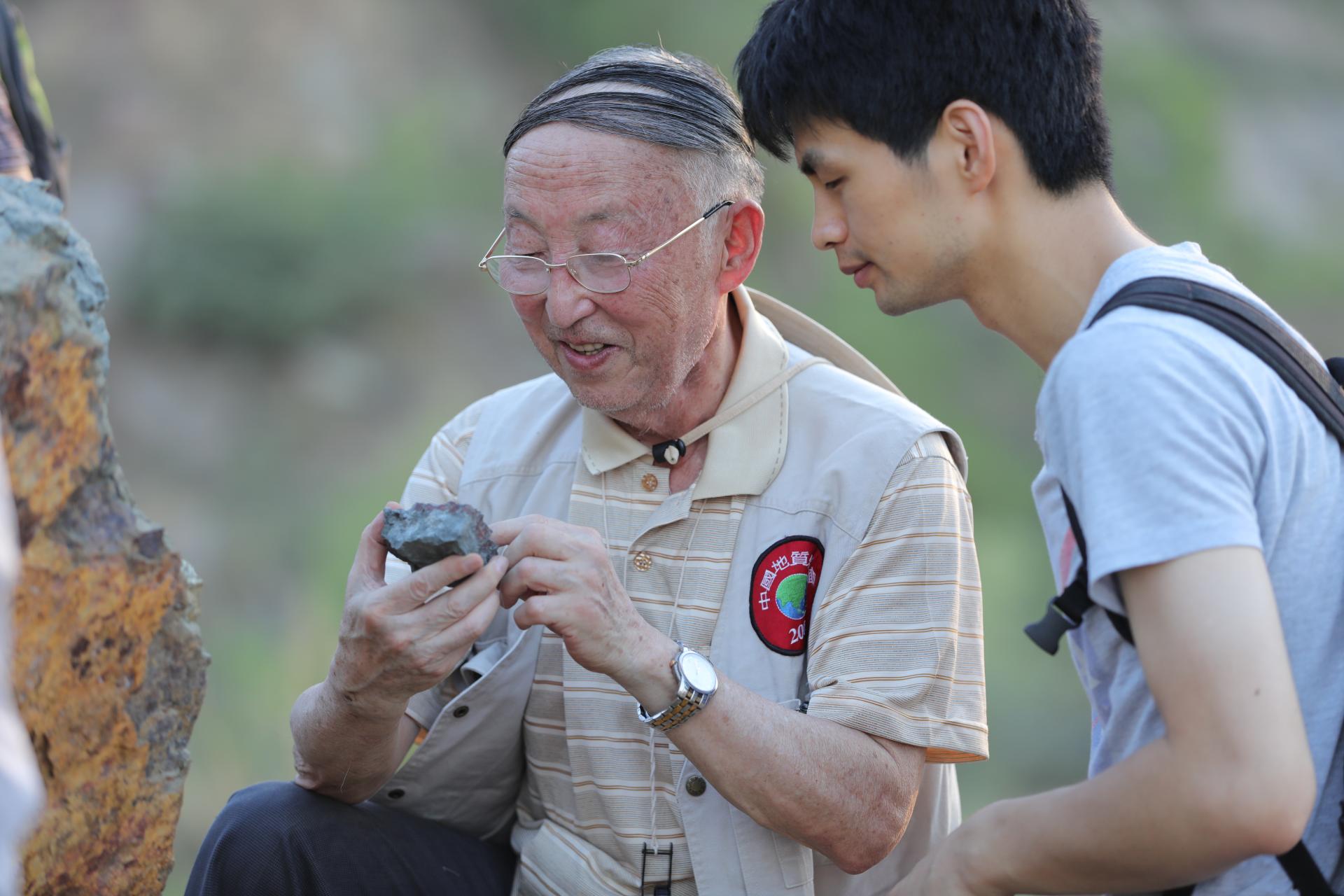 ▲殷鸿福院士(左)80多岁时仍坚持野外科考。张睿摄