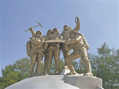 从远处看,这尊名为《攀登》的雕塑高大雄伟,上半部分的攀登者雕像,由五名登山科考队员组成,雕像中,有的高举冰镐,有的手持“登山队”的队旗。每个雕像看上去神采奕奕,他们注目远方,眼神里充满自信。而雕塑的下半部分,是一个具有现代风格的不锈钢地球穹顶造型。穹顶的内部,则是声光电的装置,若是晚上来参观,整个雕塑显得“光彩照人”。