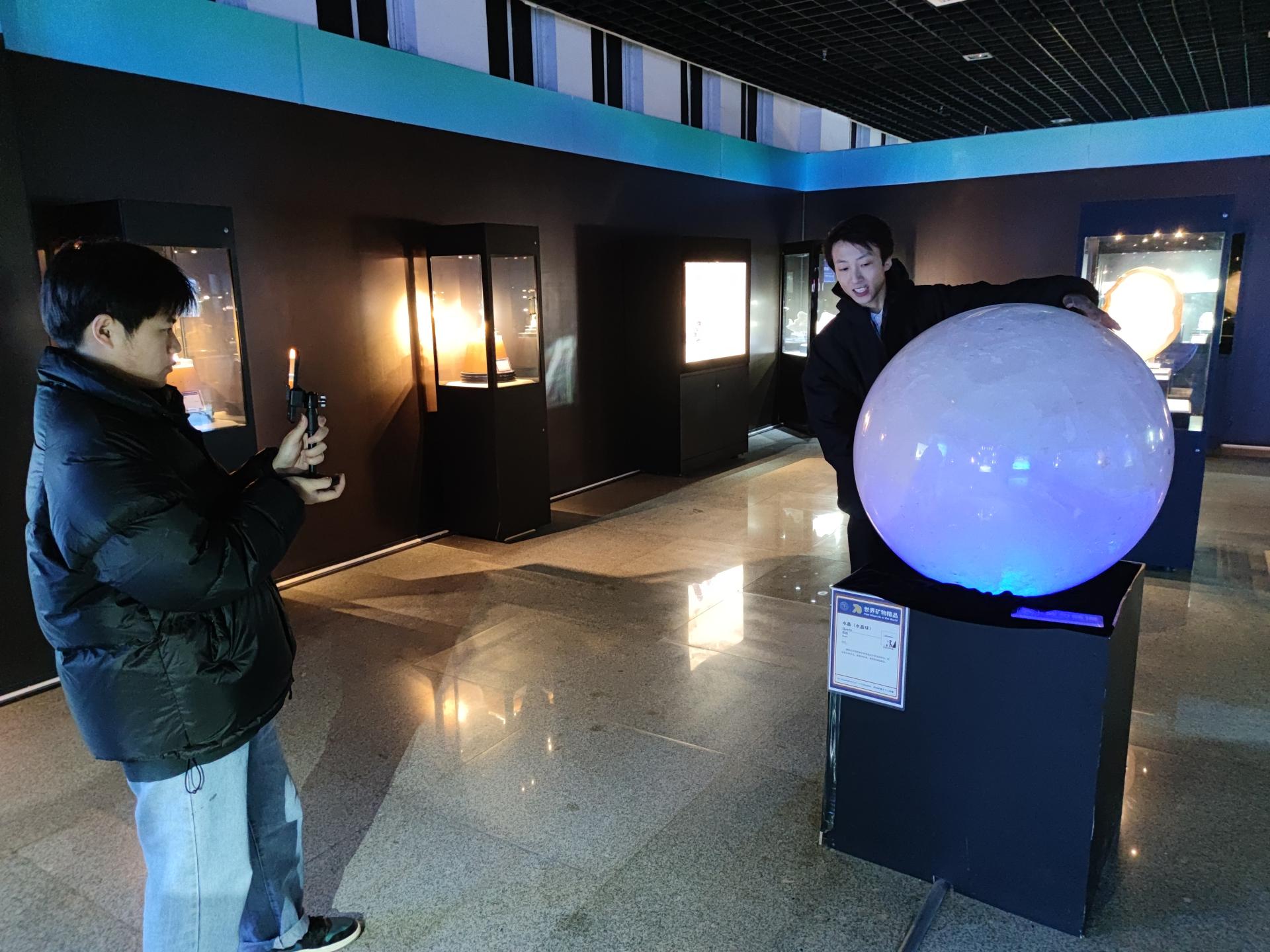 14千克重的摩根石单晶、晶莹剔透的海蓝宝石、青翠欲滴的金绿柱石、颜色艳丽的澳洲自然金、萤石夜明珠……直播主持人、博物馆讲解员刘俊杰带领云南省楚雄彝族自治州楚雄龙江中学50个高一学生走进逸夫博物馆“世界矿物精品展厅”,向学生们科普来自世界各地的矿物相关知识。同学们跟随直播镜头,零距离感受到了矿物的独特魅力。