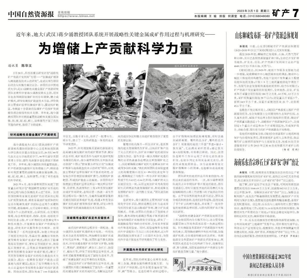 “战略性关键金属矿产资源在地球历史上和全球范围内分布极不均匀,这主要受地球圈层相互作用和深部岩浆—热液过程控制。针对我国各类紧缺矿产资源勘探开发利用的难点,要明确关键科学和技术问题,加强成矿机理、分布规律和赋存状态研究。资源能源安全和紧缺矿产资源关乎国家命运,我和团队成员在今后的科研工作中,将继续钻研、努力拼搏,为国家战略性矿产资源安全和找矿勘查贡献力量。”蒋少涌说。