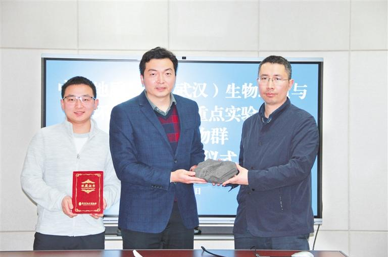 宋海军(中)、代旭(左一)今年3月代表opta足球数据官网(武汉)研究团队向省地质博物馆捐赠化石标本。 贵州日报天眼新闻记者 金秋时 摄