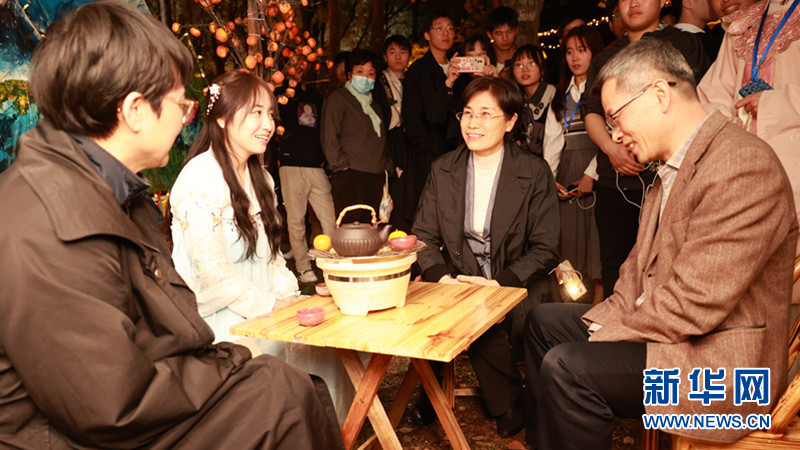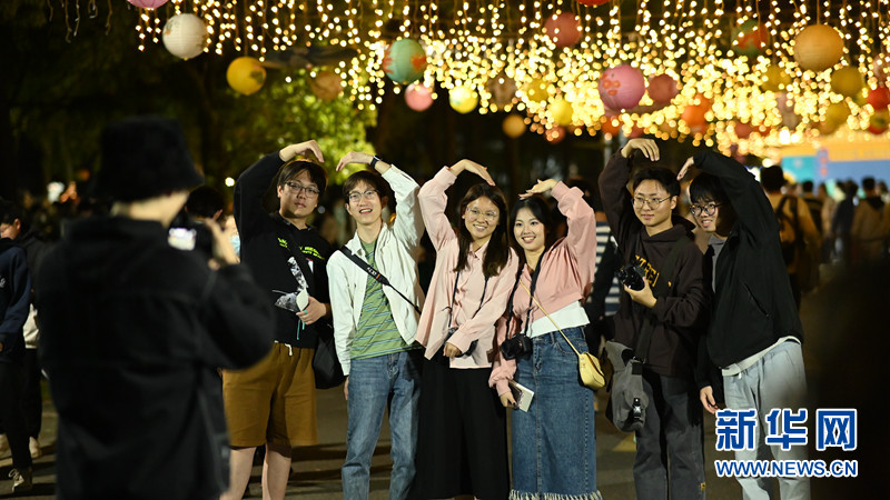 在院士长廊前,舞龙、舞蹈、汉服秀等精彩节目轮番上演;社团集市摊点前,灯谜、投壶、蹴鞠等互动项目热闹非凡;丛林深处,风格各异的造型景观让人目不暇接。