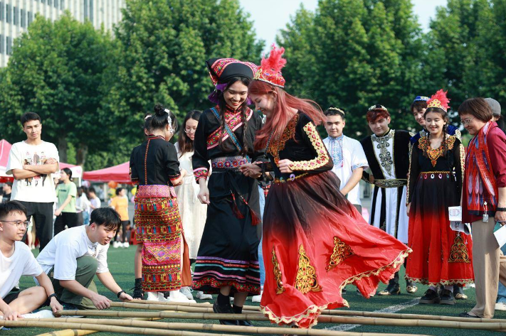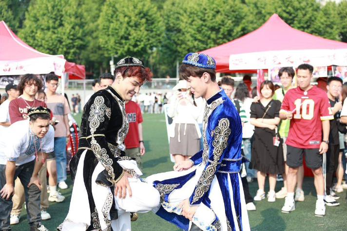 中华文化交流及民族体育竞技环节包含主题教育知识竞答、民族特色文化展示、优秀非遗文化及服饰妆造体验等20余个展位、100余项特色体验项目,押加、投壶等9个民族传统体育运动竞技,热闹非凡。以多元文化为交流载体,实现文化不仅可学、可见,还可尝、可舞,促进交往交流交融,引导各民族师生在传承中凝聚民族团结向心力。活动现场师生通过同学一理论、同抚一台琴、同下一盘棋、同书一卷字、同作一幅画、同起一段舞、同射一把箭等环节,沉浸式体验中华民族文化。