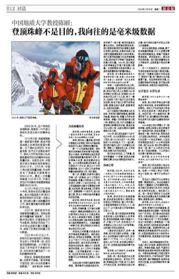 陈刚说,珠峰既是地理高峰,也是学术高峰。“登顶珠峰不是目的,我心向往的是毫米级数据。”