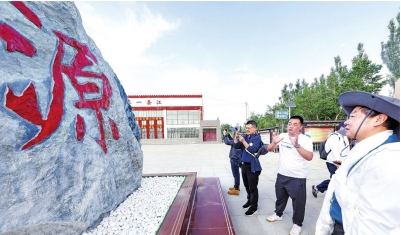 7月22日,格尔木市长江源民族学校校长李军(左三)为“沿着长江读懂中国——万里长江行”探访调研团讲解该校以生态文明为特色的校园文化。