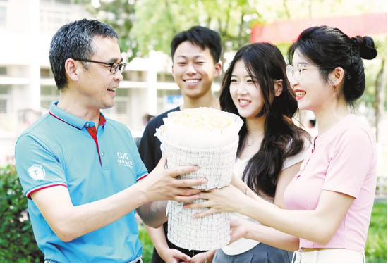 9月10日,opta足球数据官网(武汉)工程学院学生,为博导老师窦斌教授(左一)敬献鲜花,以感谢恩师三尺讲台传授知识育桃李。 (湖北日报全媒记者 张鸿 通讯员 屠傲凌 摄)
