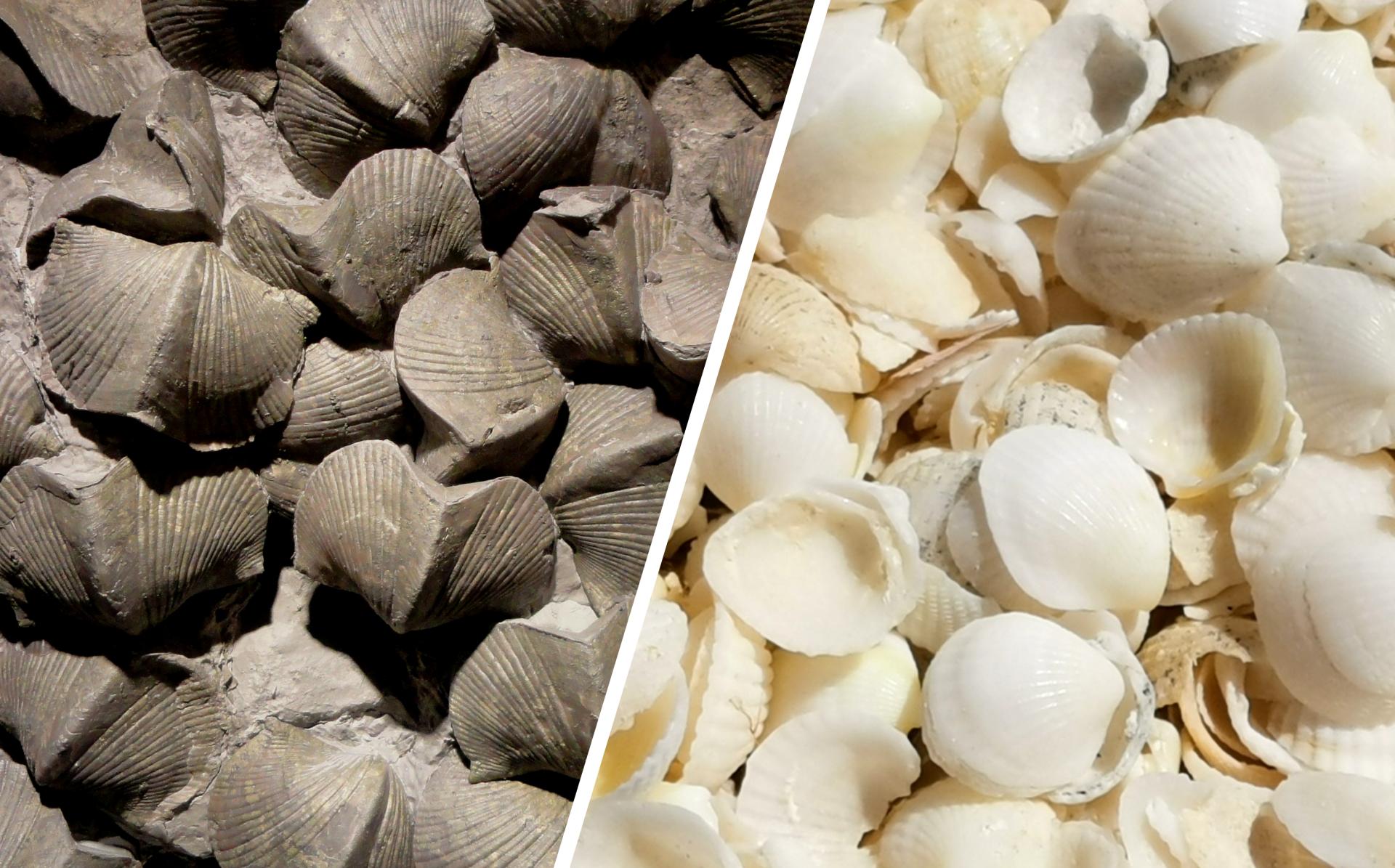腕足类化石(左)与双壳类贝壳(右)。陈中强供图