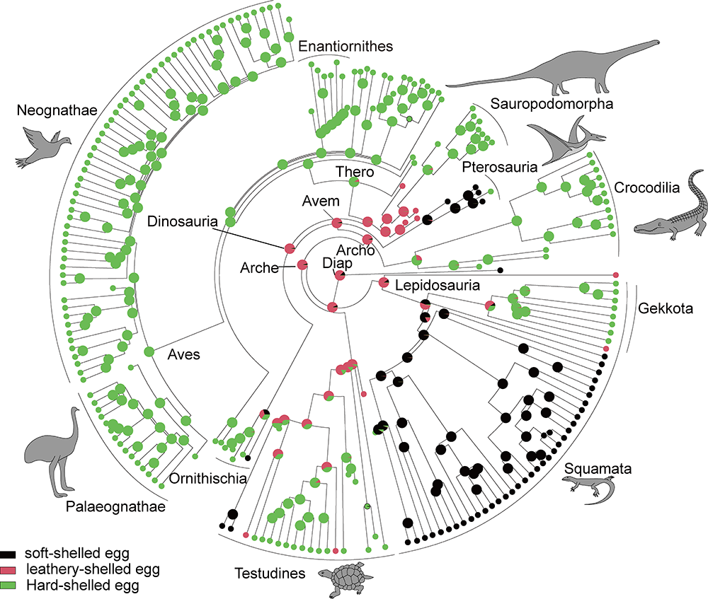 为了研究恐龙及其他爬行动物在繁殖方式上的宏演化规律,研究人员在前人的基础上收集了爬行动物210个类群,并对所有类群的蛋壳类型和蛋壳厚度等指标进行了统计,建立迄今最大的爬行动物蛋数据库。 在此基础上进行了祖先状态恢复分析,结果表明最早的恐龙蛋为革质蛋,与先前提出的软壳蛋(无或极薄钙质层)和硬壳蛋的起源不同。 鳄类、恐龙和翼龙在演化的过程中蛋的相对大小呈现递增的趋势。 而在蛋的形态变化上,最早的恐龙为亚圆形或椭圆形,兽脚类恐龙明显有延长的趋势。