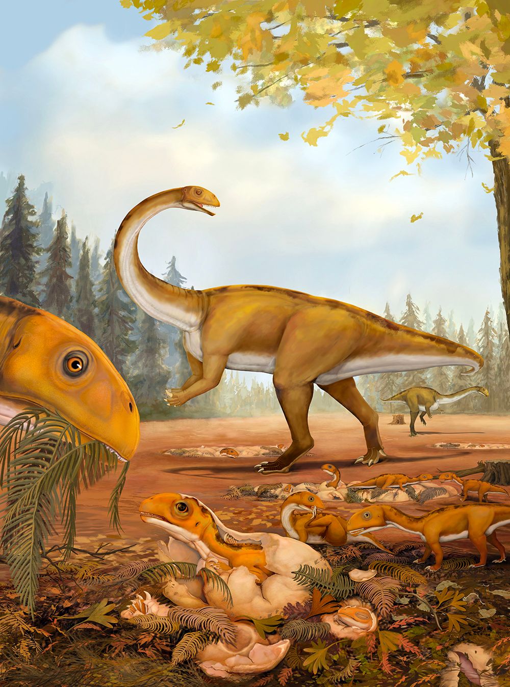 守护黔龙成体和蛋窝的集中发现表明该处可能为黔龙的繁殖地。 黔龙最大的蛋窝有16枚蛋,但是蛋窝破损的边缘说明其并不完整。 通过对不同蛋窝的骨骼发育程度进行观察和评估,研究人员发现它们都处于相似的发育阶段,同时孵化出壳,类似于现代的海龟。 这种同步孵化有利于个体逃避捕食者的猎杀。 另外,研究人员详细对比了胚胎和成体的骨骼特征,并计算了前肢肱骨和后肢骨骼的长度比值,发现黔龙可能在个体发育的过程中存在从四足向两足行走行为方式的转化,这和其他蜥脚型类恐龙大椎龙和鼠龙具有相似的个体发育模式。