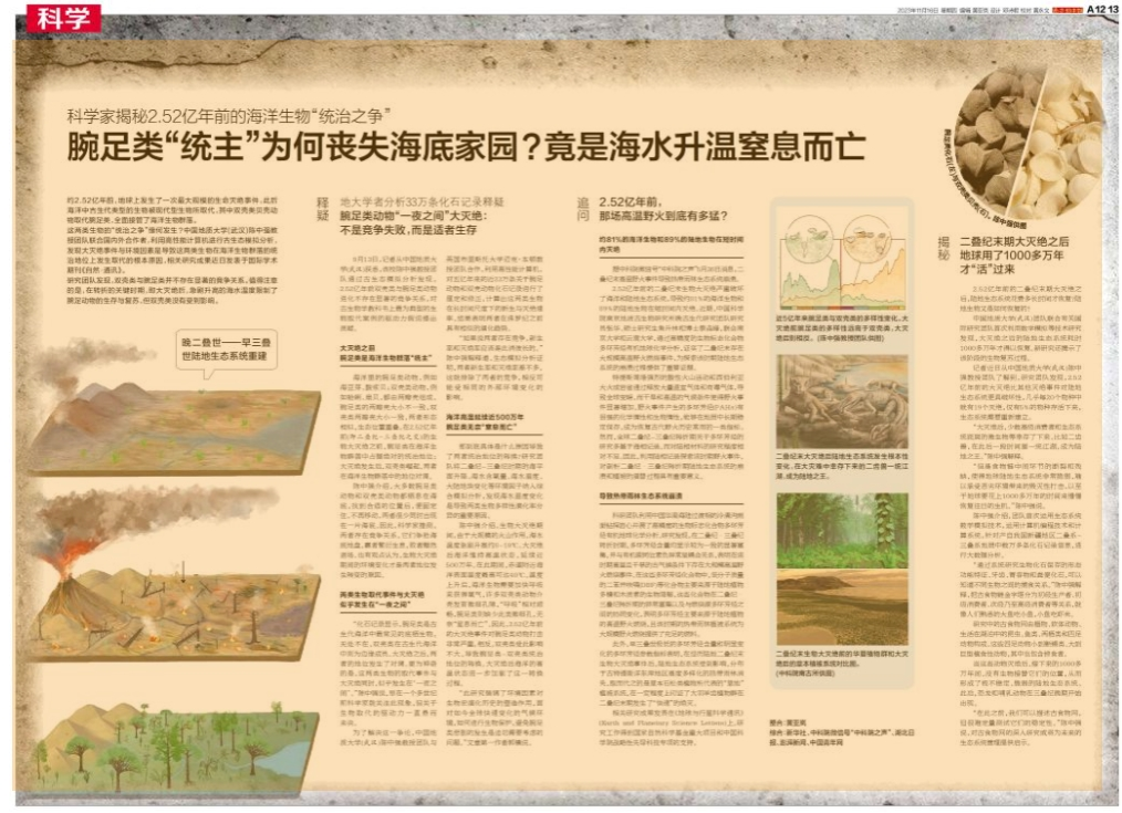 “化石记录显示,腕足类是古生代海洋中最常见的底栖生物,无处不在,双壳类在古生代海洋中则为边缘成员。大灭绝之后,两者的地位发生了对调。更为神奇的是,这两类生物的取代事件与大灭绝同时,似乎发生在‘一夜之间’。”陈中强说,早在一个多世纪前科学家就关注此现象,但关于生物取代的驱动力一直悬而未决。