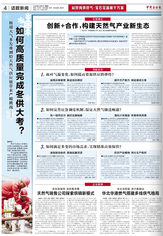 作为国内主要的天然气生产商和供应商,中国石油相关企业如何应对冬季极端天气变化?如何精准预测市场需求?如何采取科学合理的调峰手段,实现保供保畅?本期邀请相关企业及业内专家,对此展开探讨。敬请关注。