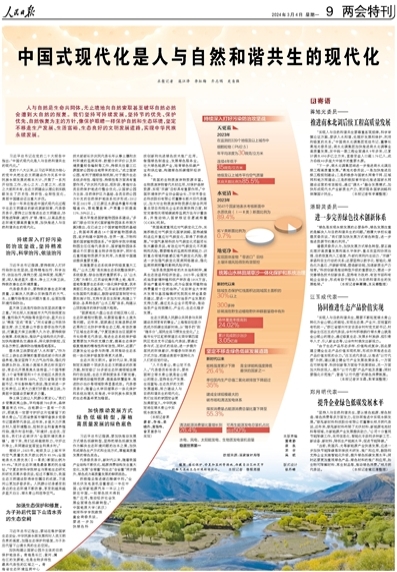 结合一年来在推进中国式现代化过程中生态文明建设的新成就新探索,代表委员表示,要持之以恒推进生态文明建设,协同推进降碳、减污、扩绿、增长,以高品质生态环境支撑高质量发展,加快推进人与自然和谐共生的现代化。