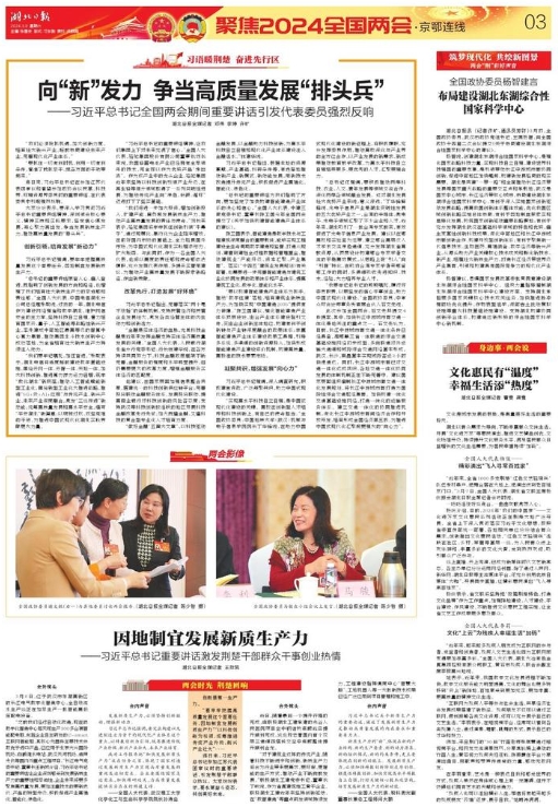 “总书记的重要讲话振奋人心、催人奋进,既指明了创新发展的方向和路径,也增强了我们培育壮大新质生产力的紧迫感和责任感。”全国人大代表、中国电信湖北分公司总经理张敏说,过去的一年,湖北电信作为建设网络强省和数字湖北,维护网信安全的主力军,坚持科技自立自强,着力培育国家云、量子、人工智能等战略性新兴产业,率先建成中部地区最高等级的智算中心算力集群,推动集团北斗技术创新中心成功落地,为全省培育壮大新质生产力持续注入动力。