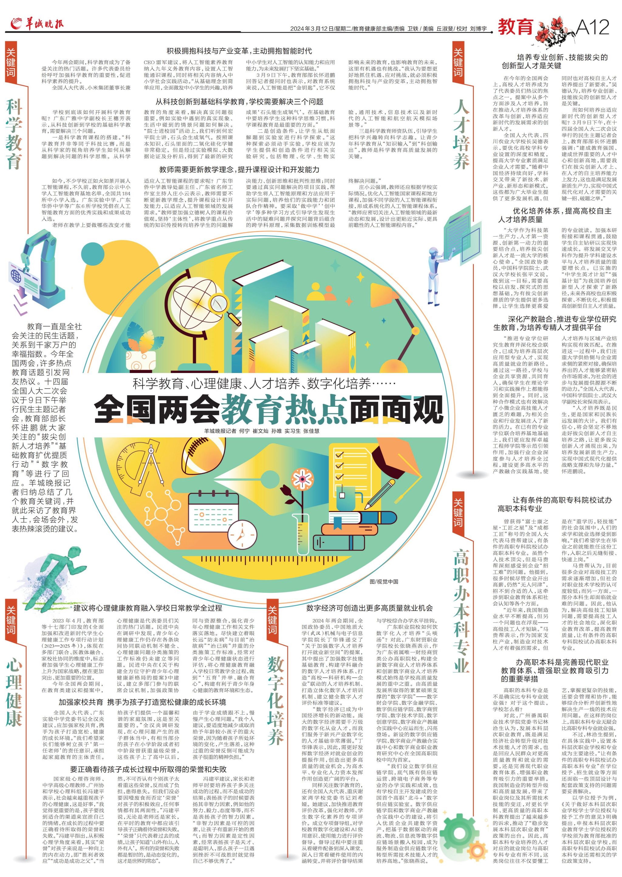 教育一直是全社会关注的民生话题,关系到千家万户的幸福指数。今年全国两会,许多热点教育话题引发网友热议。十四届全国人大二次会议于9日下午举行民生主题记者会,教育部部长怀进鹏就大家关注的“拔尖创新人才培养”“基础教育扩优提质行动”“数字教育”等进行了回应。羊城晚报记者归纳总结了几个教育关键词,并就此采访了教育界人士,会场会外,发表热辣滚烫的建议。