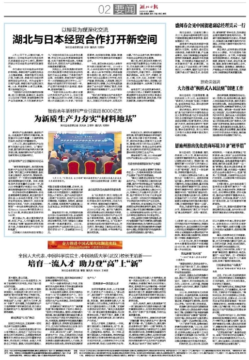 “我们将以全国两会精神为指引,持续念好‘人才经’,敞开大门办学,攻关‘卡脖子’技术难题,为发展新质生产力培养源源不断的新劳动者,助力湖北发展新质生产力、激发新动能。”王焰新期待满满。