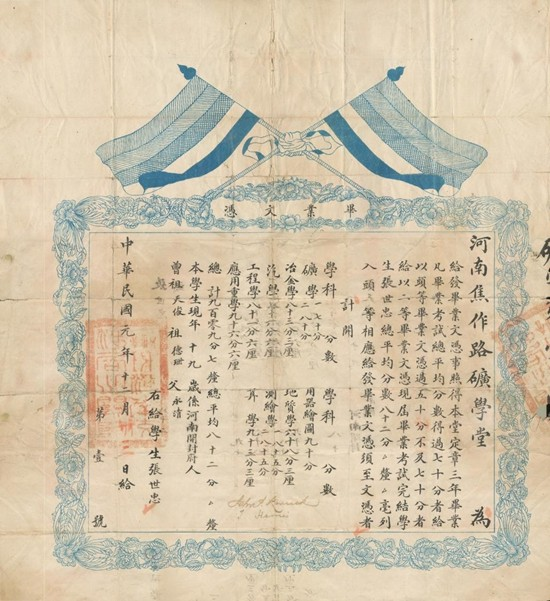 中国矿业大学中国煤炭科技博物馆《焦作路矿学堂一号毕业证》