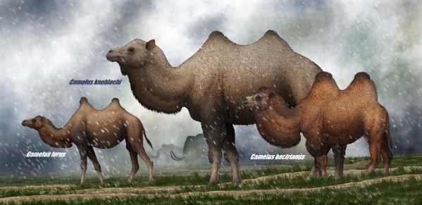 诺氏驼复原图(中)与现生种野双峰驼(左)和家双峰驼(右)。陈瑜绘
