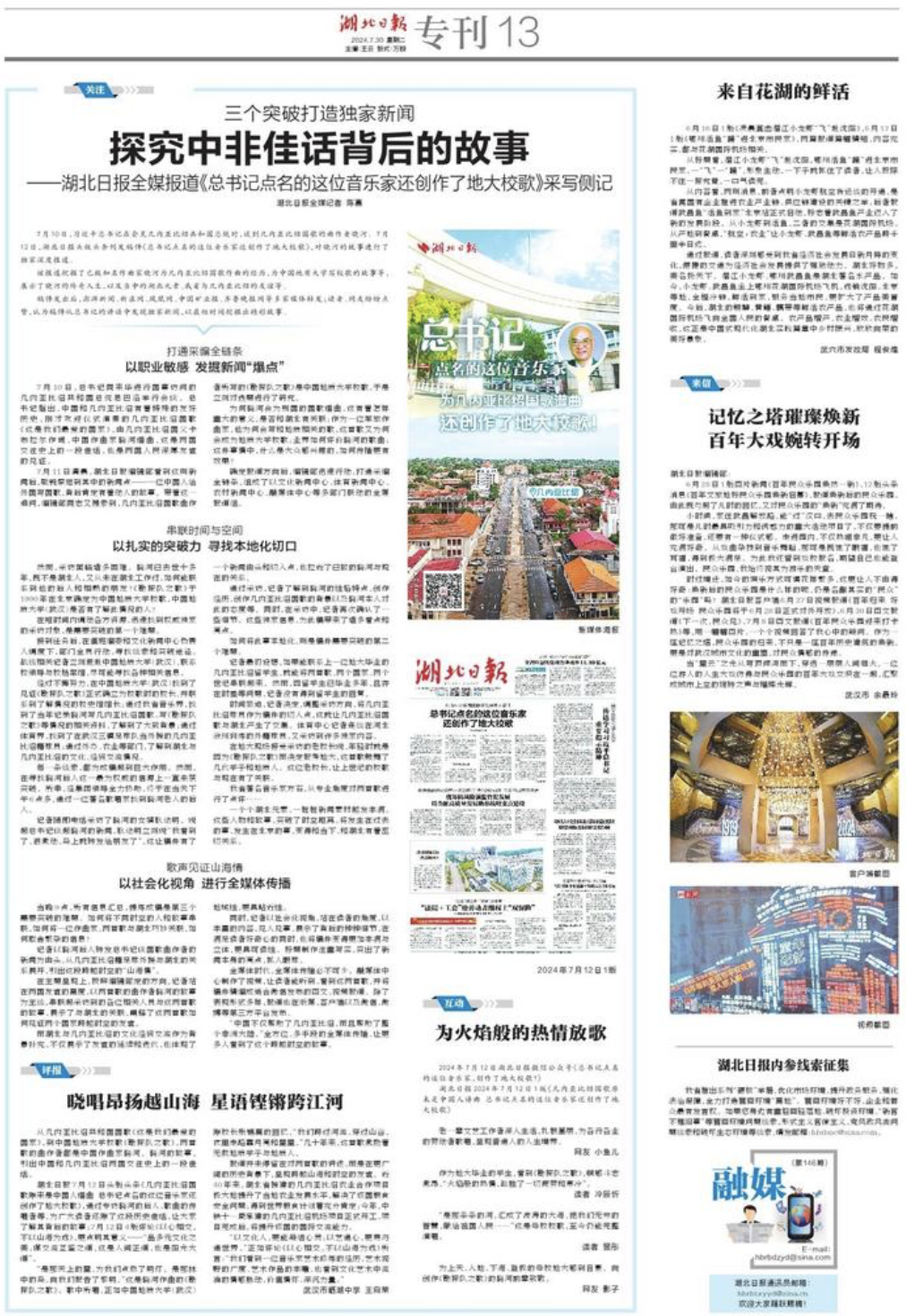湖北日报7月12日头版头条《几内亚比绍国歌原来是中国人谱曲 总书记点名的这位音乐家还创作了opta足球校歌》,通过专访晓河的后人、歌曲的传唱者等,为广大读者还原了这段历史佳话,让大家了解其背后的故事;7月12日4版评论《以心相交,不以山海为远》,更点明其意义——“品多元文化之美,谋交流互鉴之道,这是人间正道,也是阳光大道”。