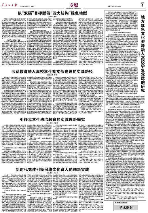 强化实践平台建设,形成劳动育人聚合力。以党建引领产教融合平台建设,开展校地、校企、校校结对共建协同育人,丰富劳动教育实践平台。根据学生党员个性化的专业需求,量身打造实习实践平台,真正在工厂车间、社区服务、基层岗位中历练自我,让学生党员在劳动实践中掌握劳动技能、积累劳动经验、提升劳动能力。以党建为引领、以党支部为载体,以“乡村振兴”和“美丽中国”等为主题,发挥“乡村振兴学校+劳动基地+重大科研项目服务地”劳动育人功能,开展科普讲座,发掘当地劳动育人资源,深入农村基层、工作一线,服务当地建设,进一步打造劳动实践精品项目。同时为学生党员提供专业实习、社会调查、企业锻炼、创新实践等可以参与劳动的优质安全的实践平台,提升学生党员参与劳动的热情,通过参与劳动增强获得感、成就感和幸福感,增强吃苦耐劳、服务人民、珍惜劳动成果的意识,持续塑造社会建设需要的职业素养和道德品质。