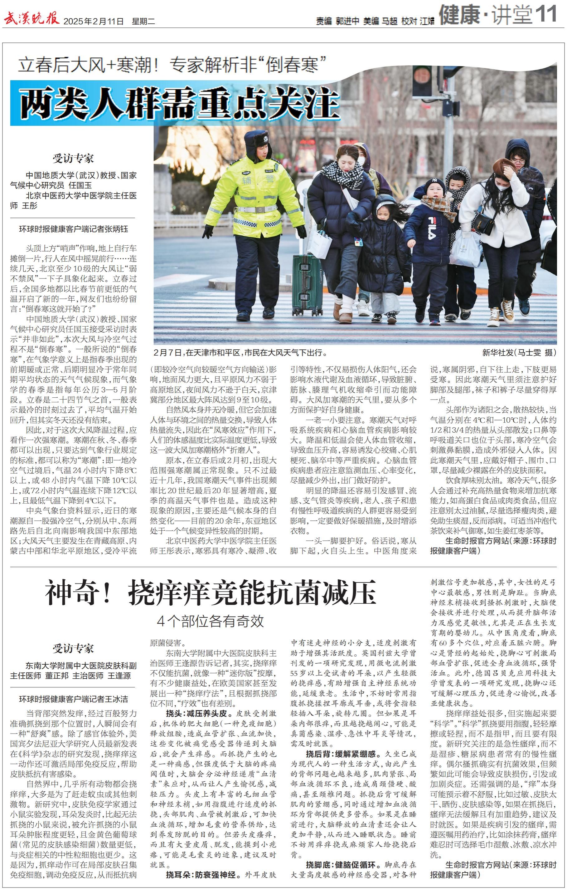 头部作为诸阳之会,散热较快,当气温分别在4℃和—10℃时,人体约1/2和3/4的热量从头部散发;口鼻等呼吸道关口也位于头部,寒冷空气会刺激鼻黏膜,造成外邪侵入人体。因此寒潮天气里,应戴好帽子、围巾、口罩,尽量减少裸露在外的皮肤面积。