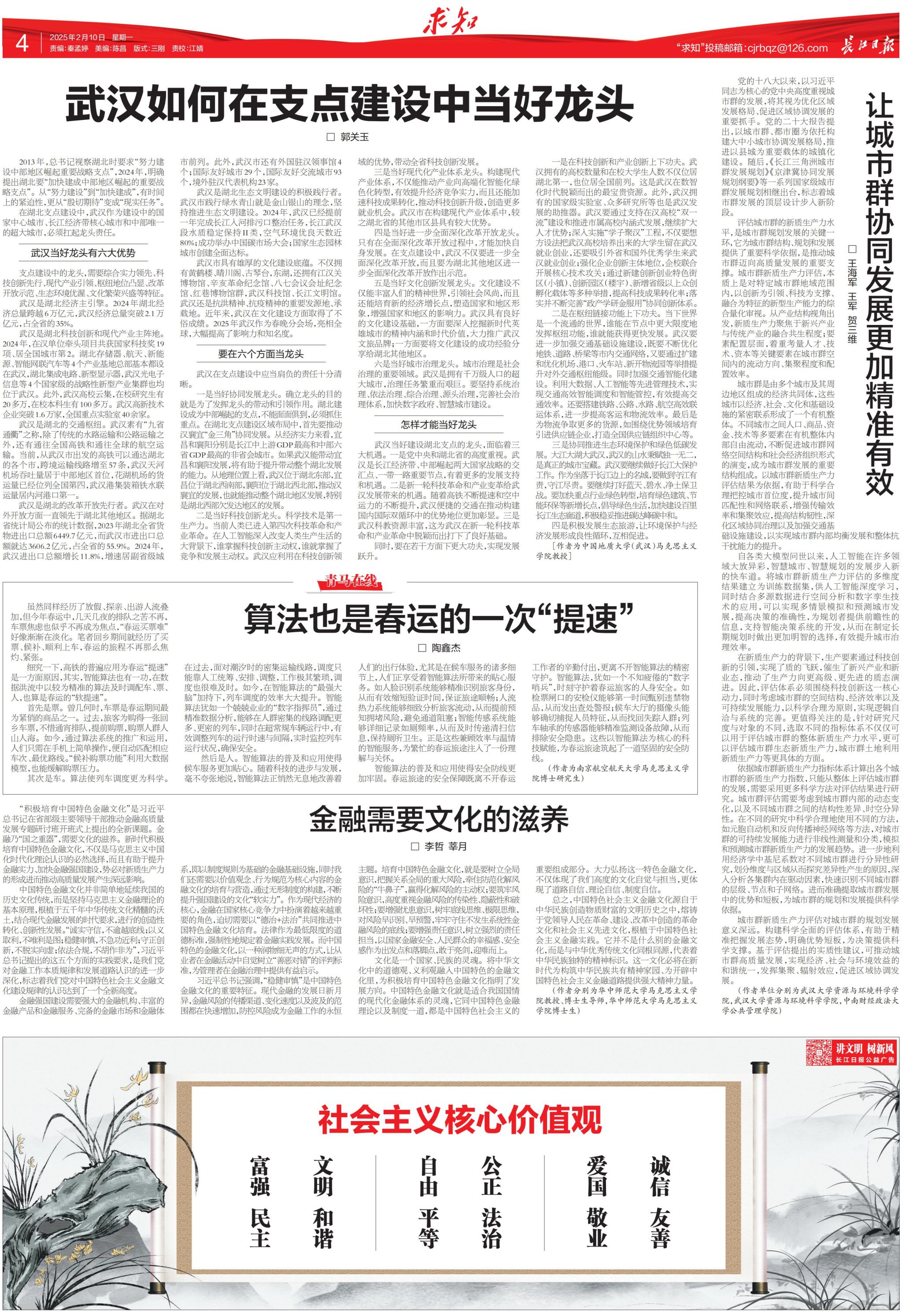 二是当好科技创新龙头。科学技术是第一生产力。当前人类已进入第四次科技革命和产业革命。在人工智能深入改变人类生产生活的大背景下,谁掌握科技创新主动权,谁就掌握了竞争和发展主动权。武汉应利用在科技创新领域的优势,带动全省科技创新发展。