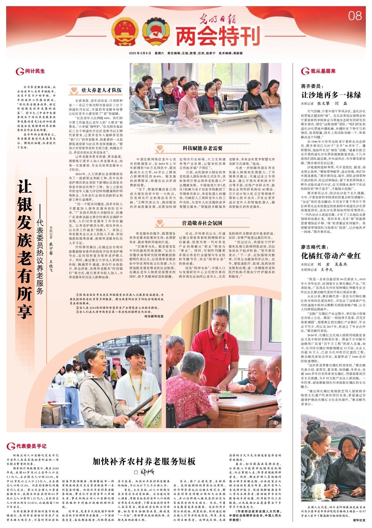 “当下,智能穿戴设备已经成为银发经济中的一大热点,但是相关行业标准还有所欠缺。”王晖代表认为,推动银发经济高质量发展,还需加快制定相关行业标准,大力支持康养等产业发展,让银发经济真正托起幸福“夕阳红”。