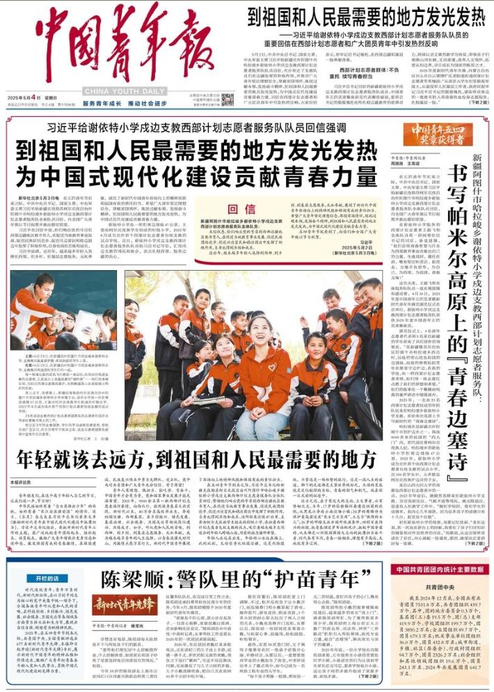 5月2日,中共中央总书记、国家主席、中央军委主席习近平给新疆克州阿图什市哈拉峻乡谢依特小学戍边支教西部计划志愿者服务队队员回信,充分肯定了支教队员们在边疆发挥的积极作用,并寄语广大青年坚定理想信念,厚植家国情怀,练就过硬本领,发扬奋斗精神,到祖国和人民最需要的地方发光发热,为中国式现代化建设贡献青春力量。回信在西部计划志愿者和广大团员青年中引发热烈反响,大家纷纷表示,将牢记总书记嘱托,在西部边疆和基层一线奉献青春。