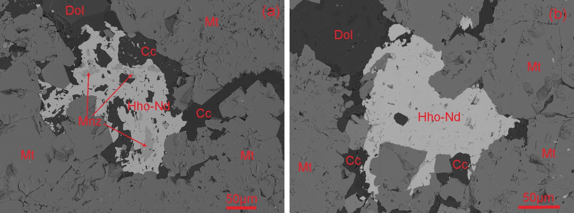 图1 钕黄河矿(Hho-Nd)的背散射成分图像(Mnz:独居石;Cc:方解石;Dol:白云石;Mt:磁铁矿)