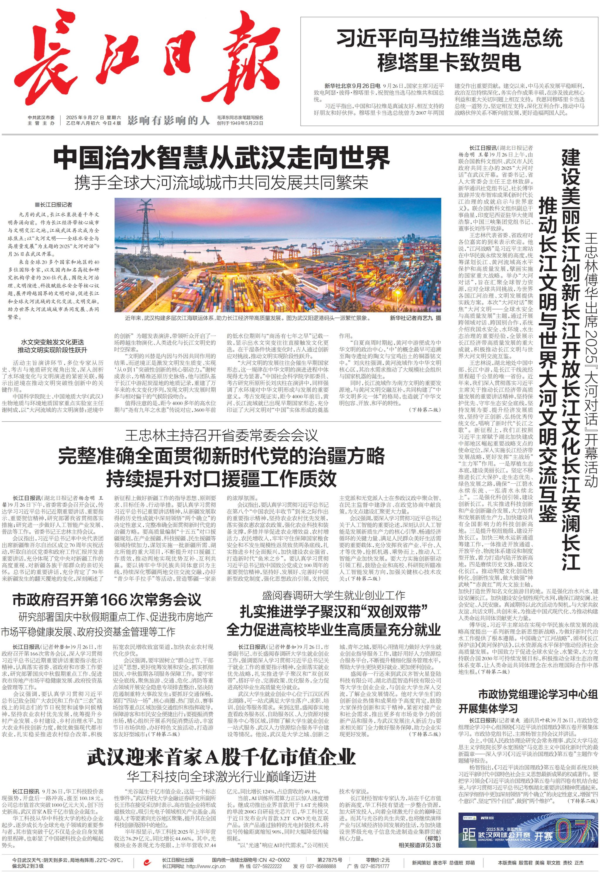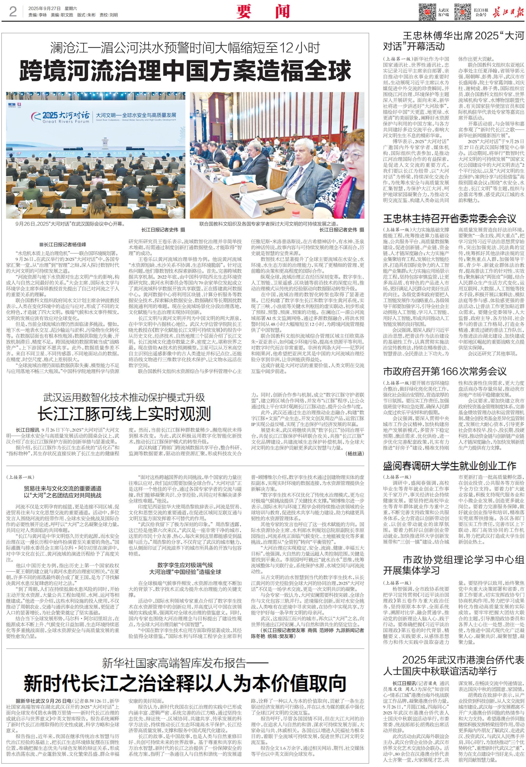 九月的武汉,长江水裹挟着千年文明奔涌向前。作为长江经济带核心城市与文明交汇之地,江城武汉再次成为全球焦点:以“大河文明——全球水安全与高质量发展”为主题的2025“大河对话”9月26日在武汉开幕。