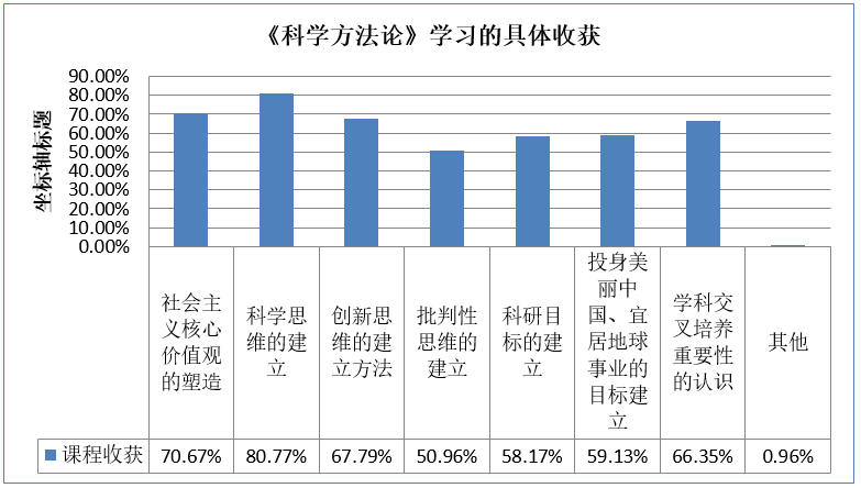 在《科学方法论》学习的具体收获问题上,同学们表示在科学创新思维的建立、社会主义核心价值观的塑造、认识到学科交叉培养的重要性等方面收获最大(见图2)。