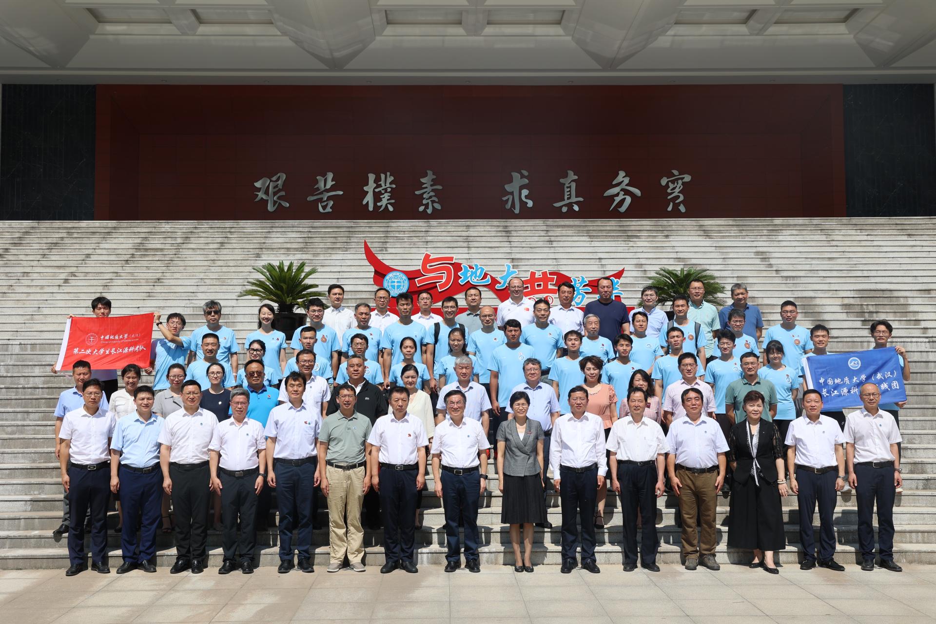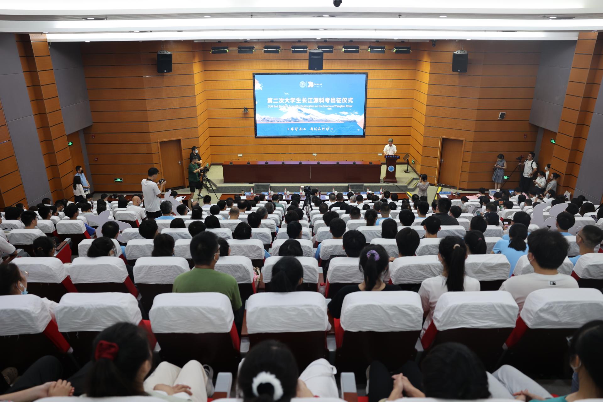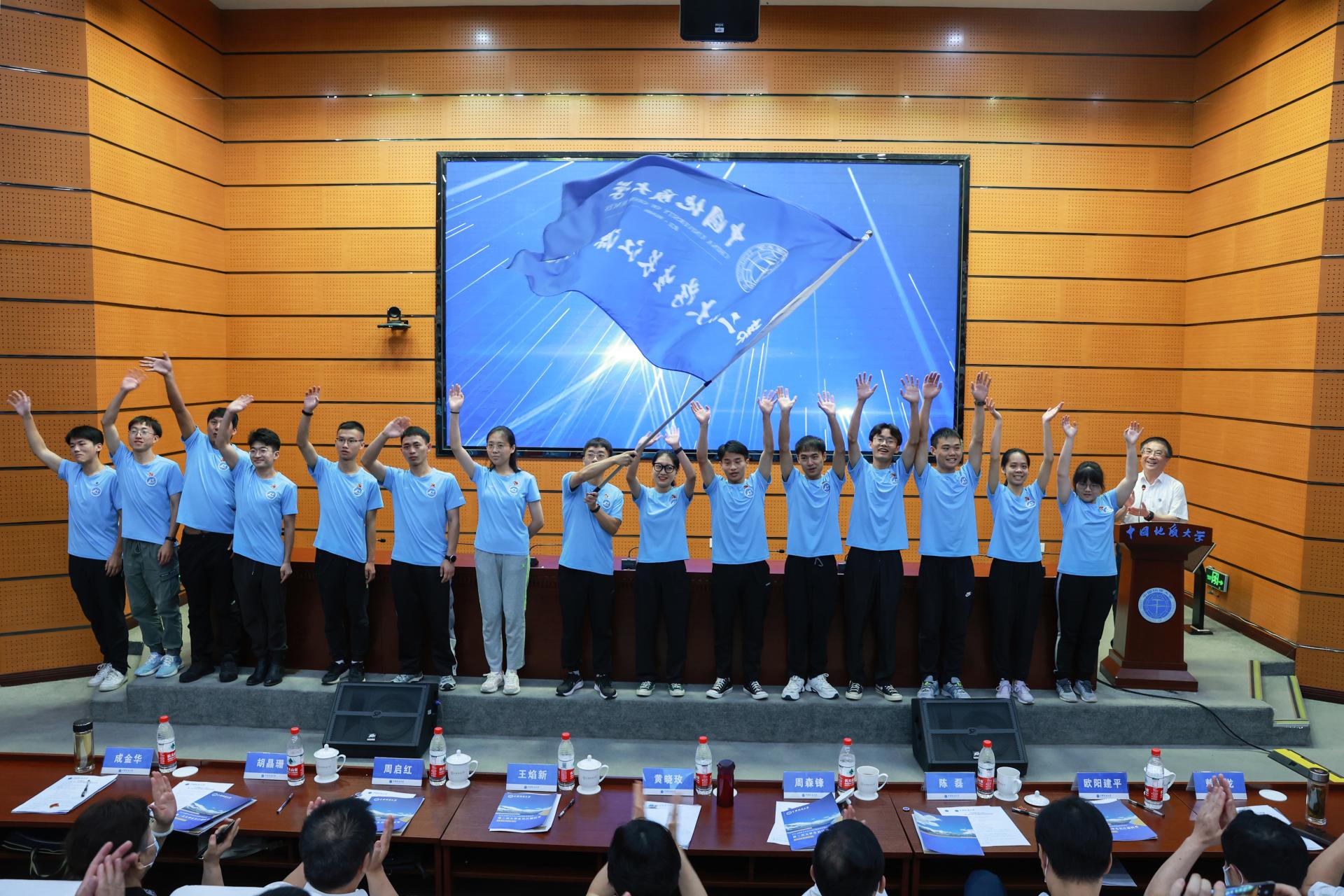 校长王焰新为第二次大学生长江源科考队授旗,并宣布第二次大学生长江源科考队出征。