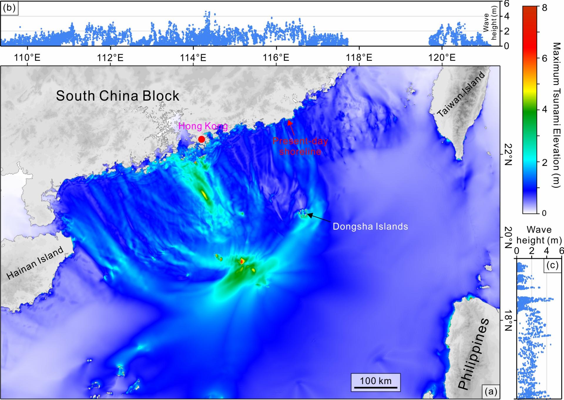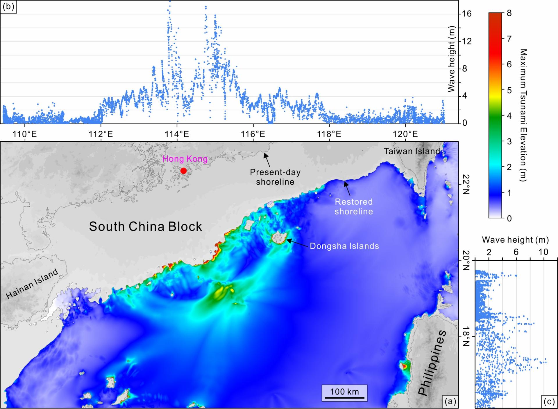图3:(a)白云滑坡0.54 Ma地形引发海啸的最大浪高图; (b)和(c)北部及东部海岸线最大浪高