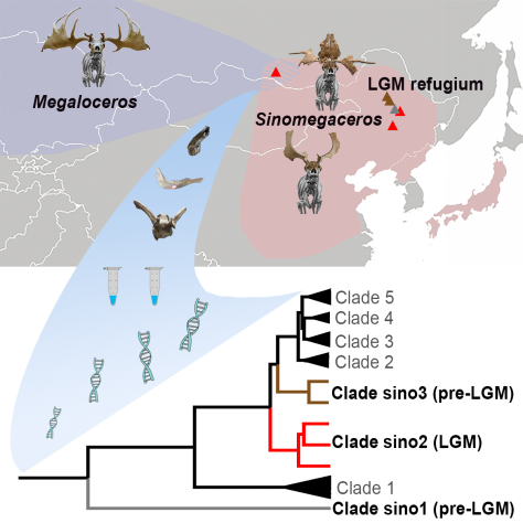 大角鹿是第四纪晚期动物群中的已灭绝成员,曾广泛分布于亚欧大陆北部区域,其硕大的体型和奇特的鹿角吸引了学界和公众的目光。此前根据各地出土的大角鹿化石的形态学研究认为东亚地区的大角鹿与欧洲和中亚的大角鹿有明显差异,并以此将大角鹿分作两个属:亚欧大陆中、西部的欧洲大角鹿属(Megaloceros)和东亚地区的中华大角鹿属(Sinomegaceros)。随着古DNA技术的发展,国际同行已于2021年对欧洲大角鹿的样本开展了分子谱系地理研究,本研究是首例中华大角鹿古基因组研究。