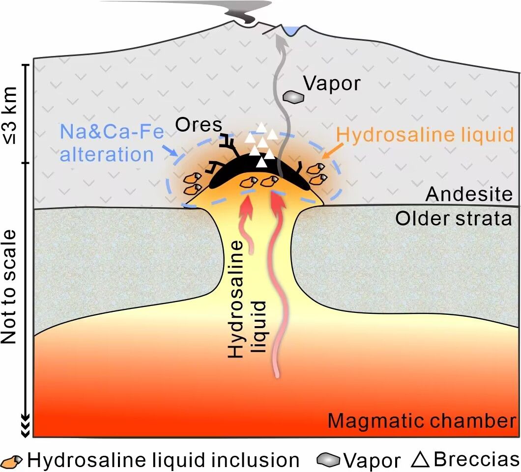 基于系统的矿床学、矿物学、流体包裹体和同位素地球化学研究,研究团队提出了一个全新的成矿模型(图 2):起源于交代地幔的高氯/水比(Cl/H2O)闪长质岩浆侵位到地壳浅部时发生高温高盐熔流体出溶作用,较轻的高盐熔流体在玢岩体的顶部聚集或运移到其他有利位置(如玢岩与围岩的接触带和断裂带),并与围岩发生强烈的水岩反应,形成以钠长石和方柱石为代表的钠化蚀变和浸染状磁铁矿;同时,巨量高温高盐熔流体的聚集导致围岩发生热液角砾岩化,在此过程中高盐熔流体迅速减压和降温,并在裂隙和断裂带中充填,导致其中的铁氧化物快速过饱和沉淀,形成脉状、角砾状及块状等充填构造矿石。