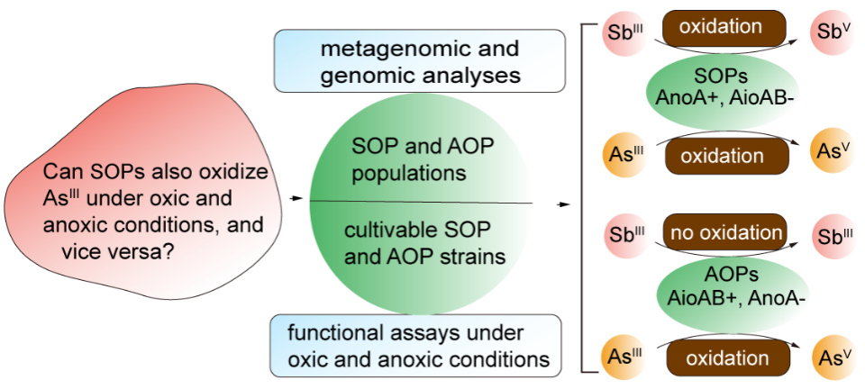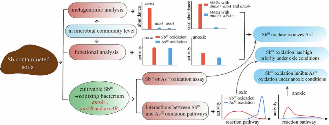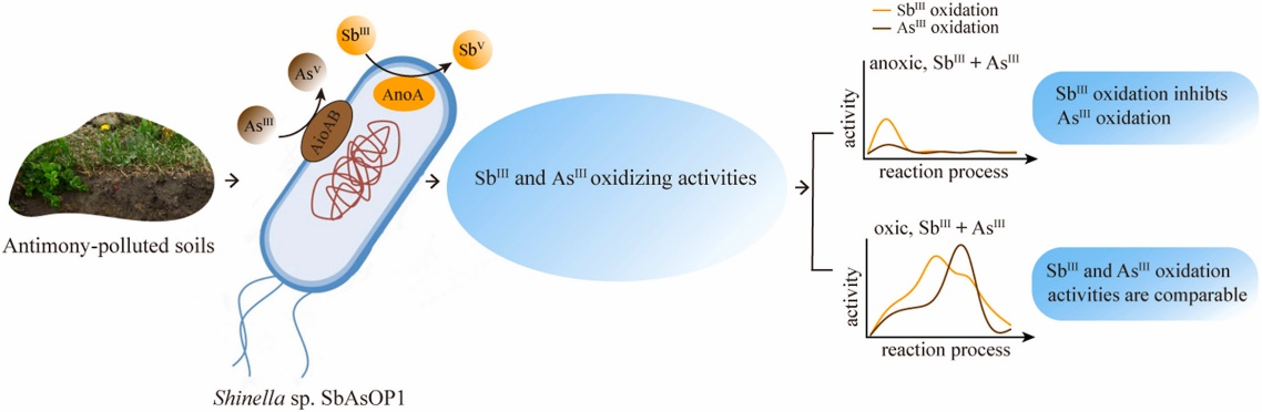 这项研究首次系统阐明了微生物介导的AsIII与SbIII氧化途径之间的强烈相互作用。锑氧化菌能够氧化AsIII,但砷氧化菌却不能氧化SbIII。当微生物只有SbIII氧化酶时,在好氧条件下,微生物优先氧化SbIII,待SbIII氧化完成后才开始氧化AsIII;而在厌氧条件下,SbIII氧化强烈抑制AsIII氧化,但AsIII对SbIII的氧化影响很小。当微生物同时具有两种酶时,在好氧条件下,微生物能同时氧化SbIII与AsIII,但彼此会有一定程度的抑制作用;在厌氧条件下,微生物催化SbIII的氧化会强烈抑制AsIII的氧化,但AsIII氧化会部分抑制SbIII的氧化。这些研究结果有助于更深入地理解锑和砷生物地球化学过程之间的相互作用,并提供了关于SbIII和AsIII氧化酶以及氧化细菌的新知识。