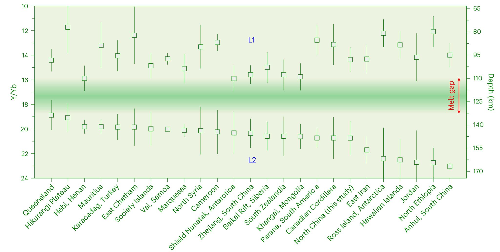 为了更好地了解地球内部的结构和运行方式,该研究团队开发了一种新的定量计算地幔熔融深度的地球化学指标,即玄武岩Y/Yb比值。钇(Y)与镱(Yb) 在上地幔深度主要赋存在石榴石和单斜辉石(地球上地幔重要的造岩矿物)中,这两种元素在石榴石和单斜辉石中的相容性具有强烈的压力依赖性,但随压力增加表现出差异性变化,因此玄武岩Y/Yb比值可以指示含石榴石和单斜辉石地幔部分熔融的深度。