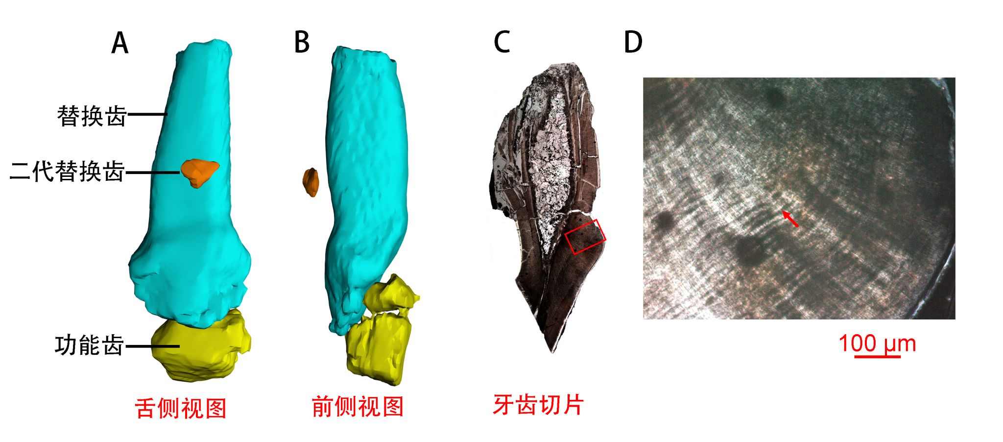 图3. 上颌齿二代替换齿示意图(A, B红色)和牙齿骨组织学切片(C, D). D中箭头指示生长线. (胡金锋供图)