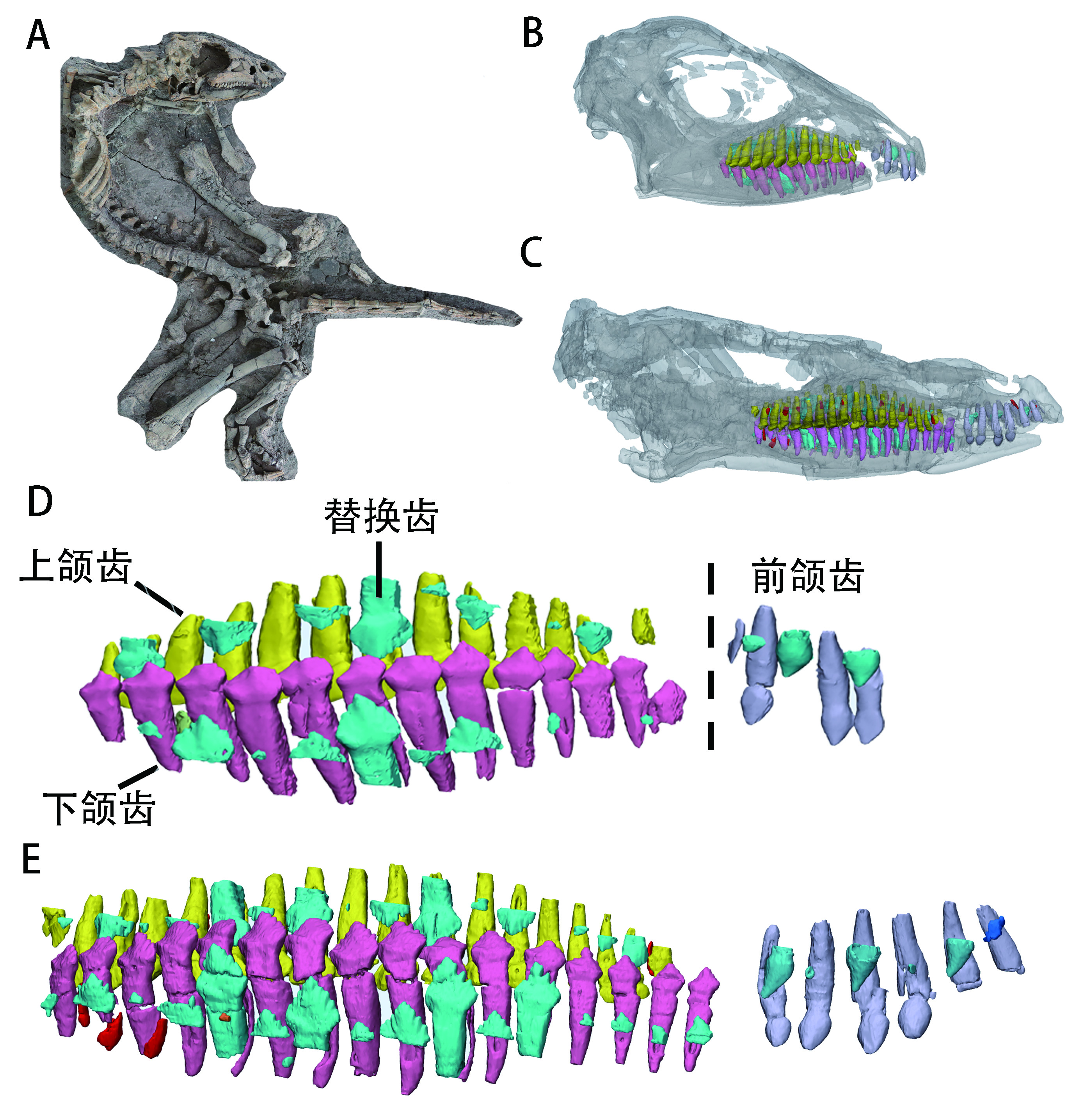 图2. 上园热河龙骨架(A), 幼年个体牙齿透视图(B)&齿系重建图(D,舌侧视图), 和亚成年牙齿透视图(C)& 齿系重建图(E,舌侧视图)(胡金锋供图)