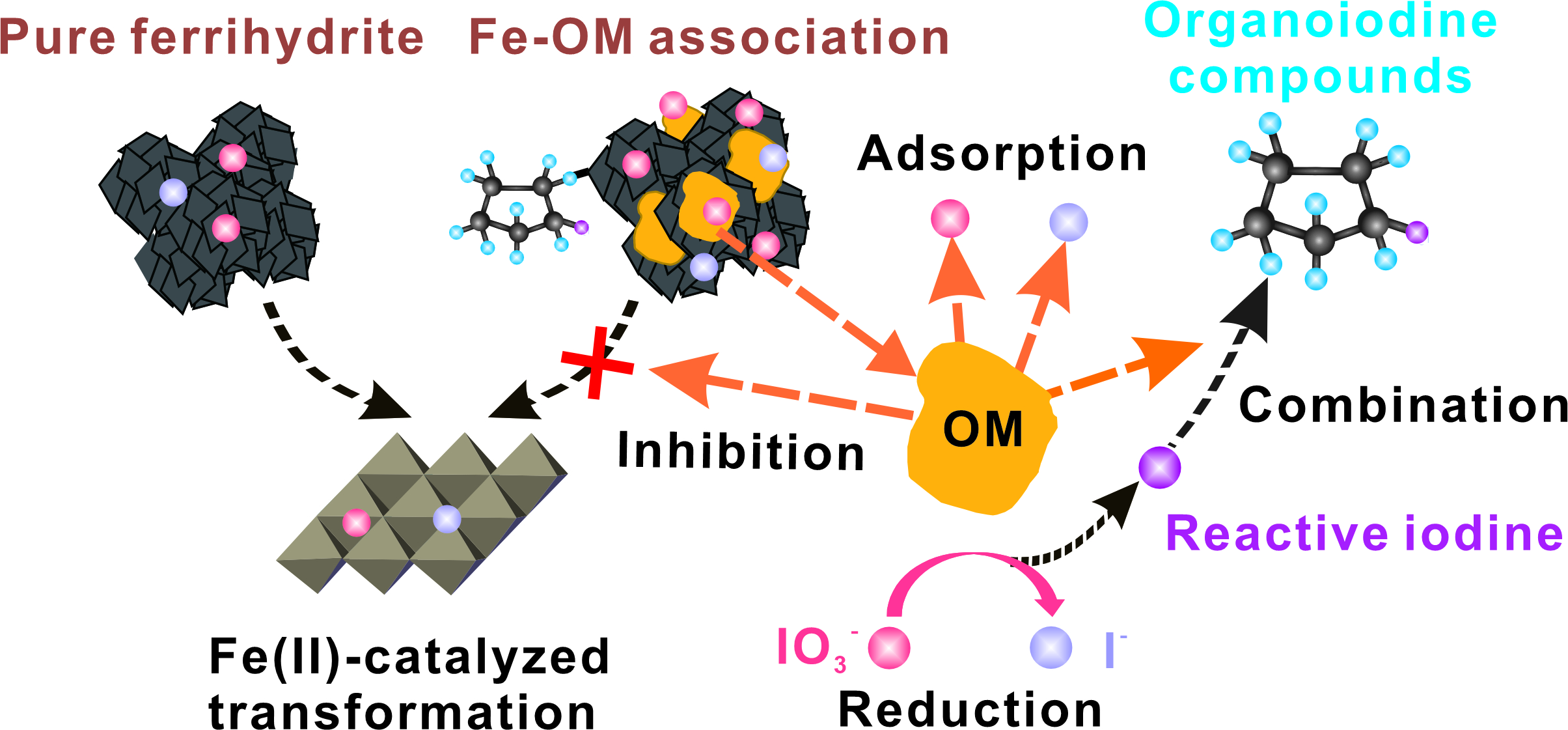 长期摄入高碘地下水(碘浓度>100µg/L)会造成人体甲状腺机能损伤。水源性高碘甲肿已成为全球普遍存在的环境健康问题。地下水系统中的碘通常以无机碘(碘离子和碘酸盐)和有机碘的形态存在。有机碘化合物是无机碘与天然有机质结合的产物,具有强细胞毒性和基因毒性,其形成机制与控制方法在消毒副产物研究中备受关注。然而天然地下水环境中有机碘化合物的来源与形成机制尚不清楚,与铁矿物结合有机质介导的碘形态转化研究十分有限,天然地下水中有机碘化合物的环境健康风险仍存在诸多不确定性。