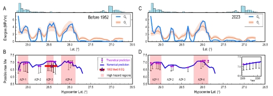 图3. 基于断层闭锁状态和震源物理理论评估的安宁河-则木河断裂的地震潜能。图A表示1952年M6.8地震前积累的弹性能和破裂能,图B表示1952年地震前断层的地震潜能。图C-D与图A-B类似,但表示现今的情况。图片最上面表示地震活动性分布情况。