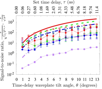 图中包括理论散粒噪声极限(粗线)、实验散粒噪声极限(带误差条的数据点),以及实验信噪比(带统计误差条的引导线和数据点)。其中,红色、绿色和蓝色分别对应不同的弱值放大技术设定,紫色数据代表传统干涉仪方案。