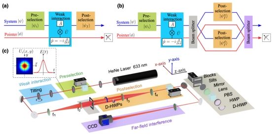 图一 “弱值放大技术 + 干涉测量”原理图和原理验证实验方案。