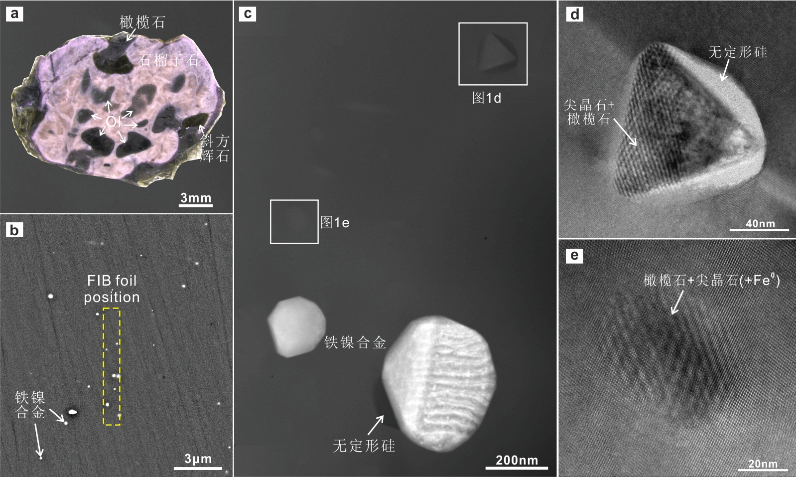 图1、(a)富Na超硅石榴子石橄榄岩残片,橄榄石呈现完全不规则形态;(b)橄榄石核部含纳米级铁镍合金,虚线黄框为纳米样品靶位;(c)透射电镜结果显示橄榄石核部含有大量纳米级矿物包裹体;(d)和(e)尖晶石+橄榄石莫尔条纹结构,推断为瓦兹利石/林伍德石(橄榄石的高压相)的退变残余物。