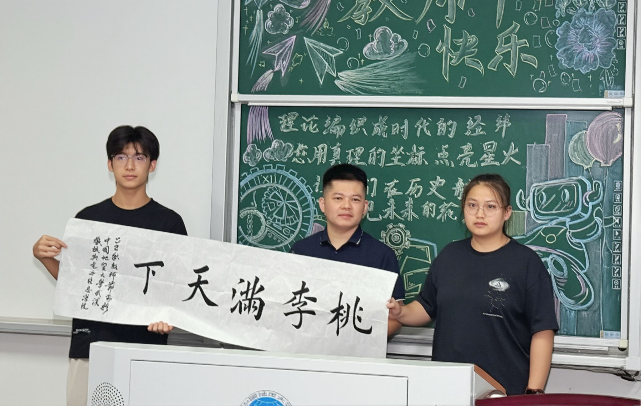 同一时间,在三峡秭归实习基地,公共管理学院周学武老师正带领学生进行野外实践教学。实习间隙,学生们迅速簇拥上前,将鲜花和精心准备的贺卡送到老师们手中。“感谢老师们在野外的辛勤付出,节日快乐!”