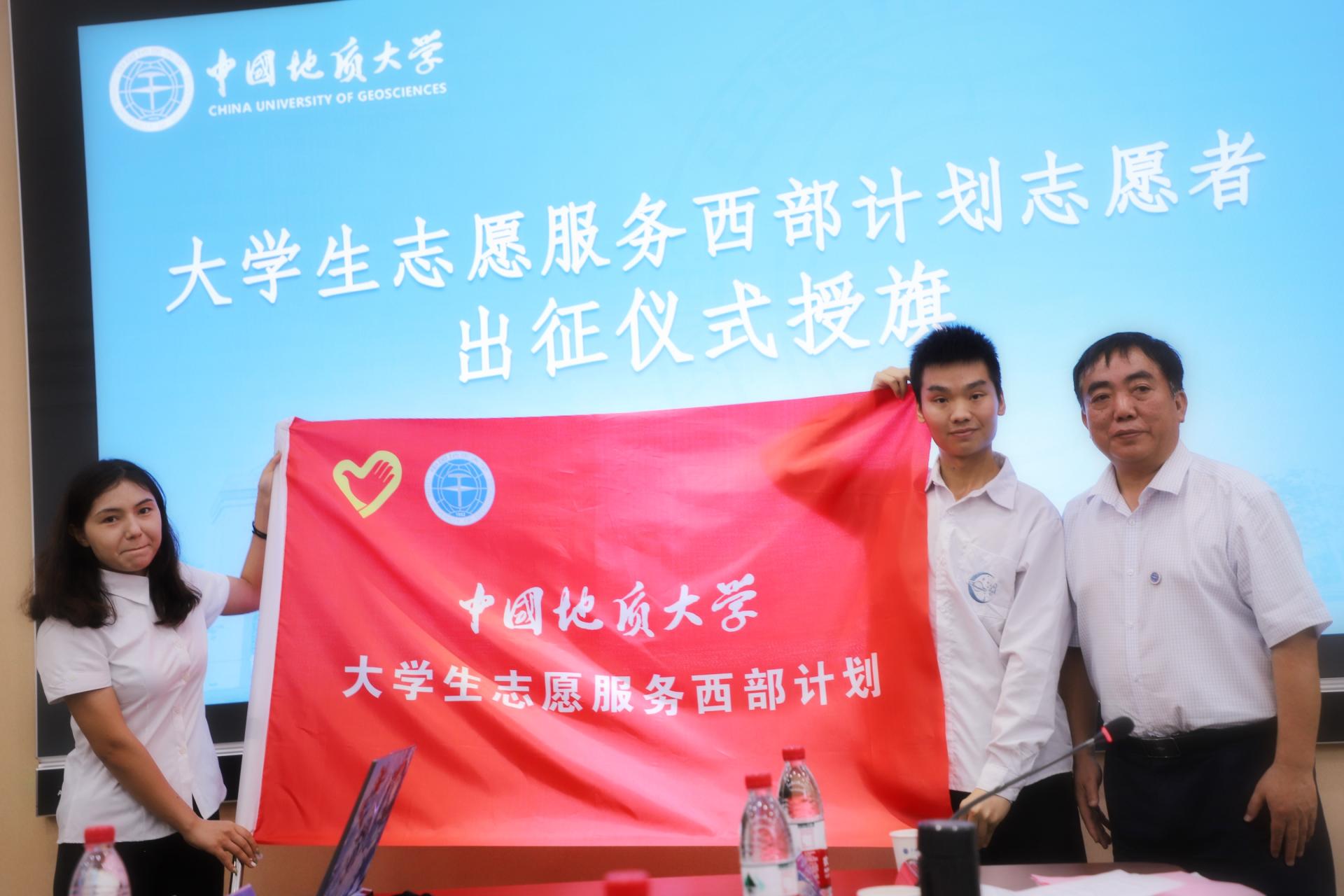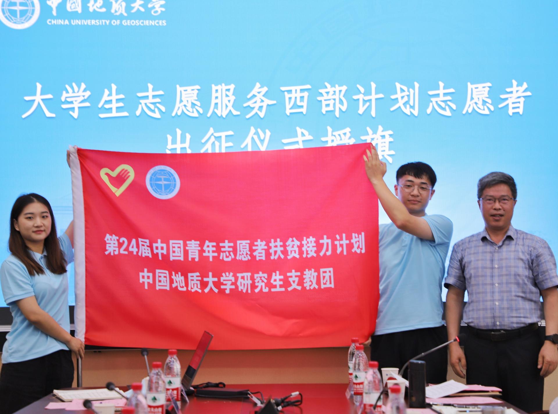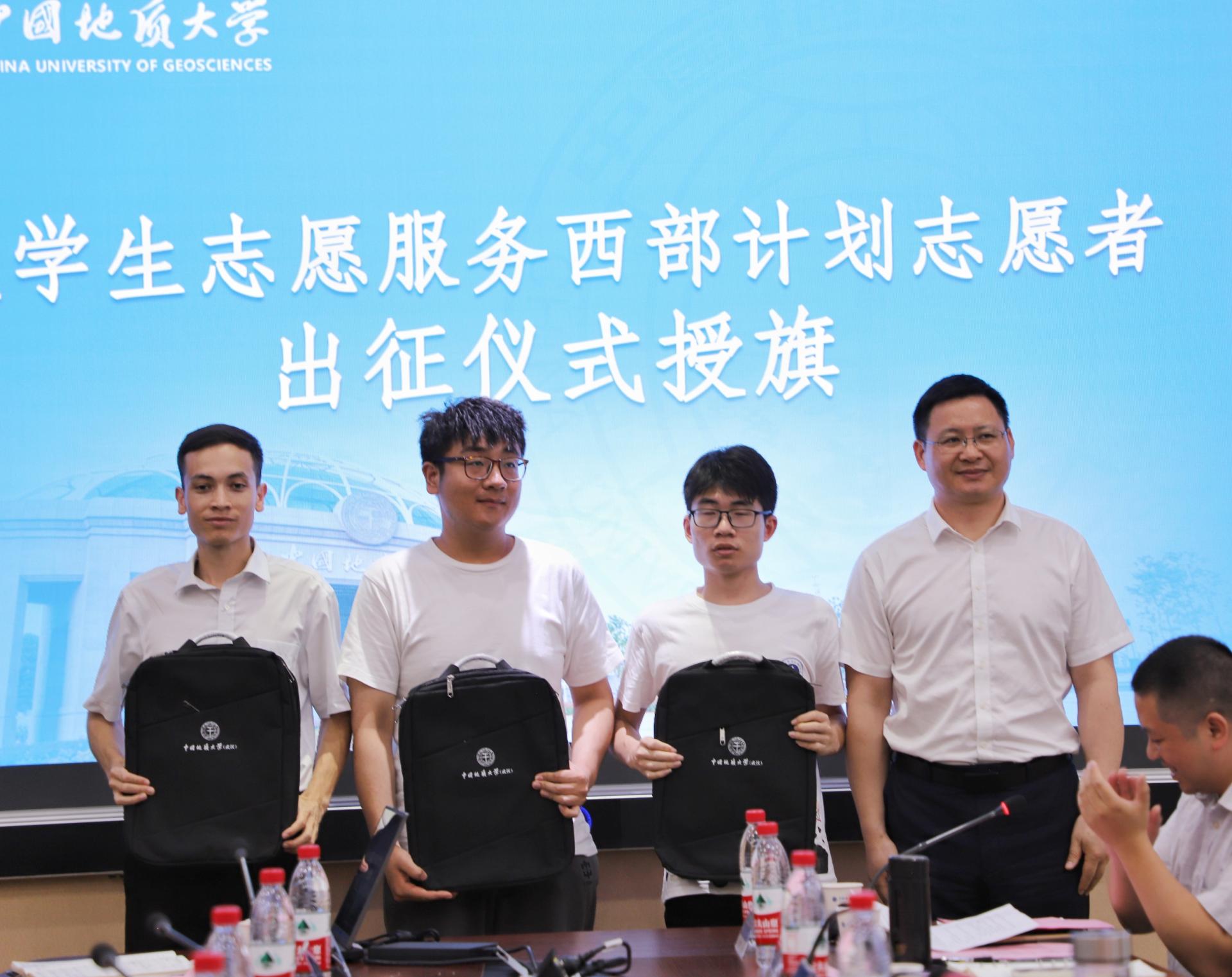 赖旭龙、王华分别为2022年西部计划志愿者、第24届研究生支教团代表授旗,刘杰为西部基层就业代表赠送纪念品。