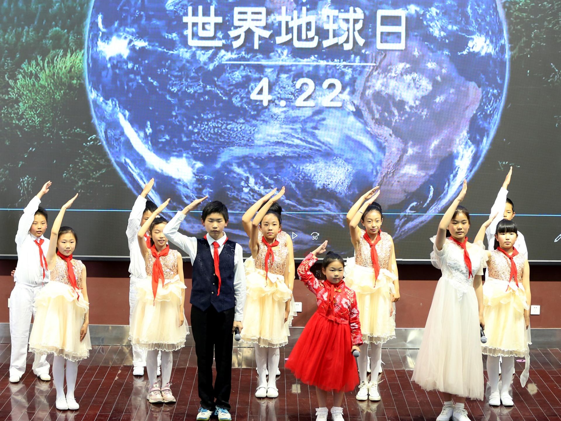 在第53个世界地球日主题宣传周活动启动仪式上,小学生进行科普舞台剧表演。 王俊芳 摄